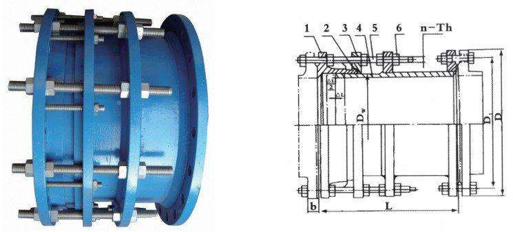 VSSFAF(CC2F)型可拆式雙法蘭傳力接頭:安裝在管道上后,根據所需的伸縮的伸縮距離進行限位,擰緊螺母,彈性密封圈在螺母壓蓋的作用下依靠相互斜度,緊壓在管子外圈起密封和連接作用,主要和管道閥門連接不但起到管道補償作用,更方便了閥門的維修及更換。